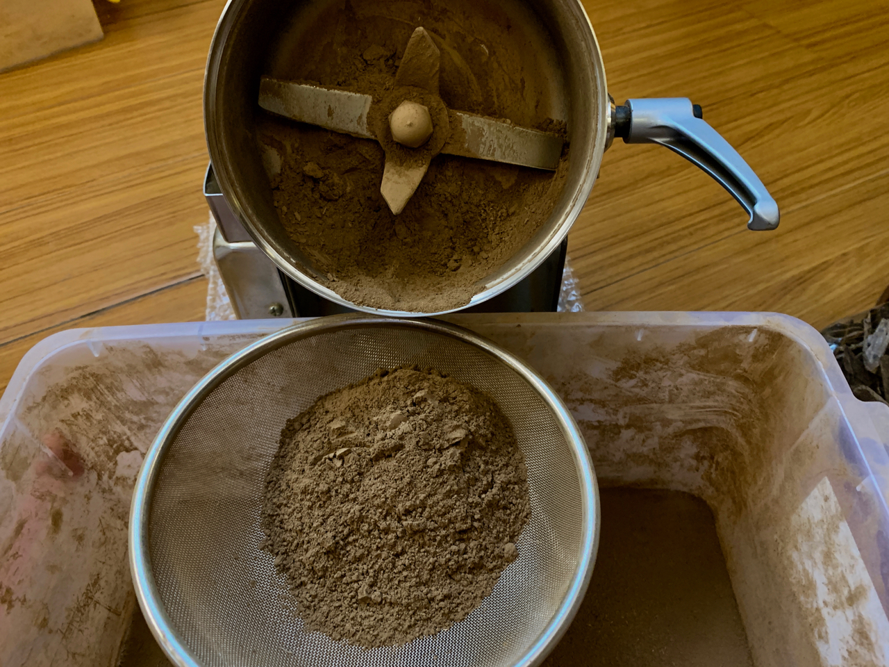 工作室的沉粉所用的打粉機,只單純打粉而不研磨的機器,在沉香的原材料的選擇上,以土沉香及沒有什麼白肉(木質部)的野生沉殻為原料,再經人工過篩的方式,來篩去油量較少的木質部,所以工作室沉粉的品質才得以維持一定的水準及品質,篩去油量較少的木質部的粗粒,其成本都是一樣,所以可以通過篩網的沉粉,成本自然就更高,而留下的粗粒只適合煎香,並不適合販售,當然這些粗粒煎香起來的香味還是非常好的,畢竟還都是野生老沉香,只是木質部多一些,這些粗粒除了自己用來煎香,有時也會免費送給來訪的香友當煎香料使用。