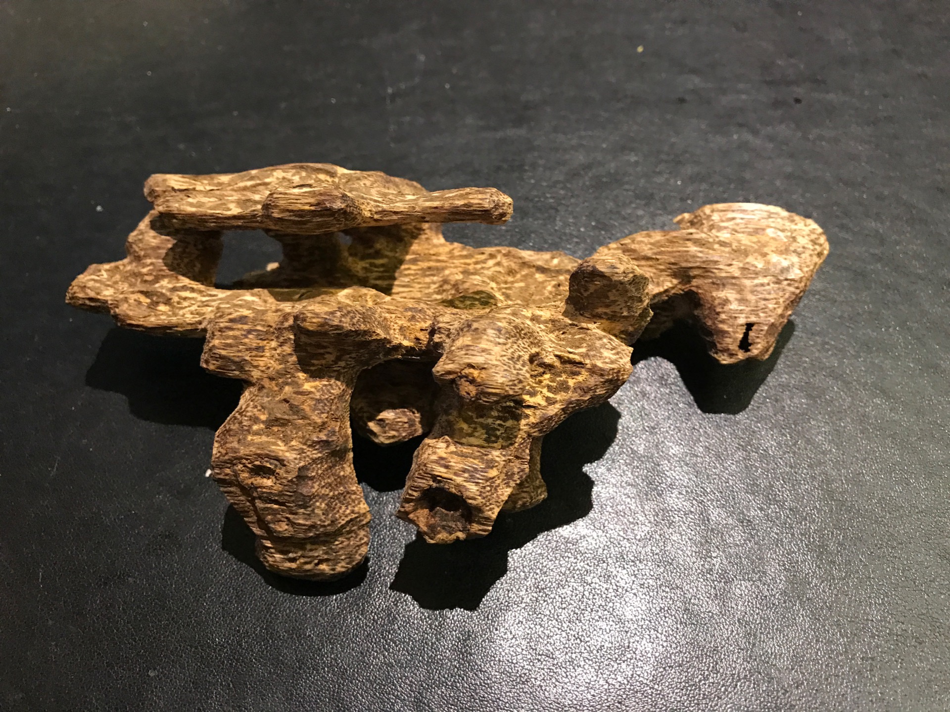 像照片這類可當成擺件的蟲漏沉香,在市場中也已經非常少見了,現在有的大多都屬較小料或是結香比較差的料,還可在市場中可以見到,不過多數已經不是正野生料了,除了早期有收藏到,目前要再收藏極品蟲漏沉香也是愈來愈不容易了。